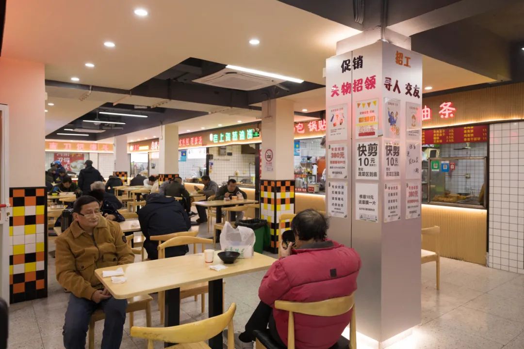 此外,市集中庭还放置了公共座椅作为用餐区,改变传统菜市场买了就走的模式,让大家多一个坐坐、聊聊的温馨场所。市集还设置了百姓喜闻乐见的便民项目,家电维修、小修小补、配钥匙、理发等小店一应俱全,满足居民日常生活的需求,真正成为“坐得住、留得下、卖得好”的邻里市集。