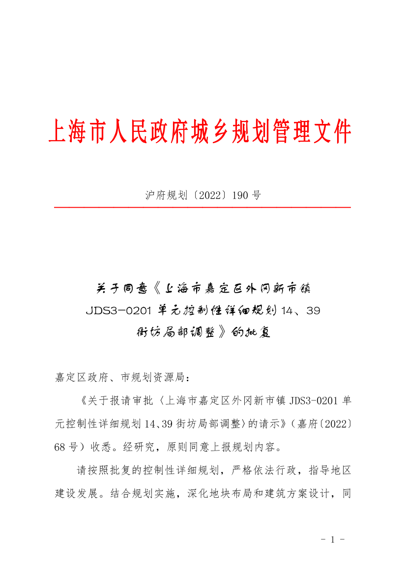 《关于报请审批〈上海市嘉定区外冈新市镇JDS3-0201单元控制性详细规划14、39街坊局部调整〉的请示》(嘉府〔2022〕68号)收悉。经研究,原则同意上报规划内容。