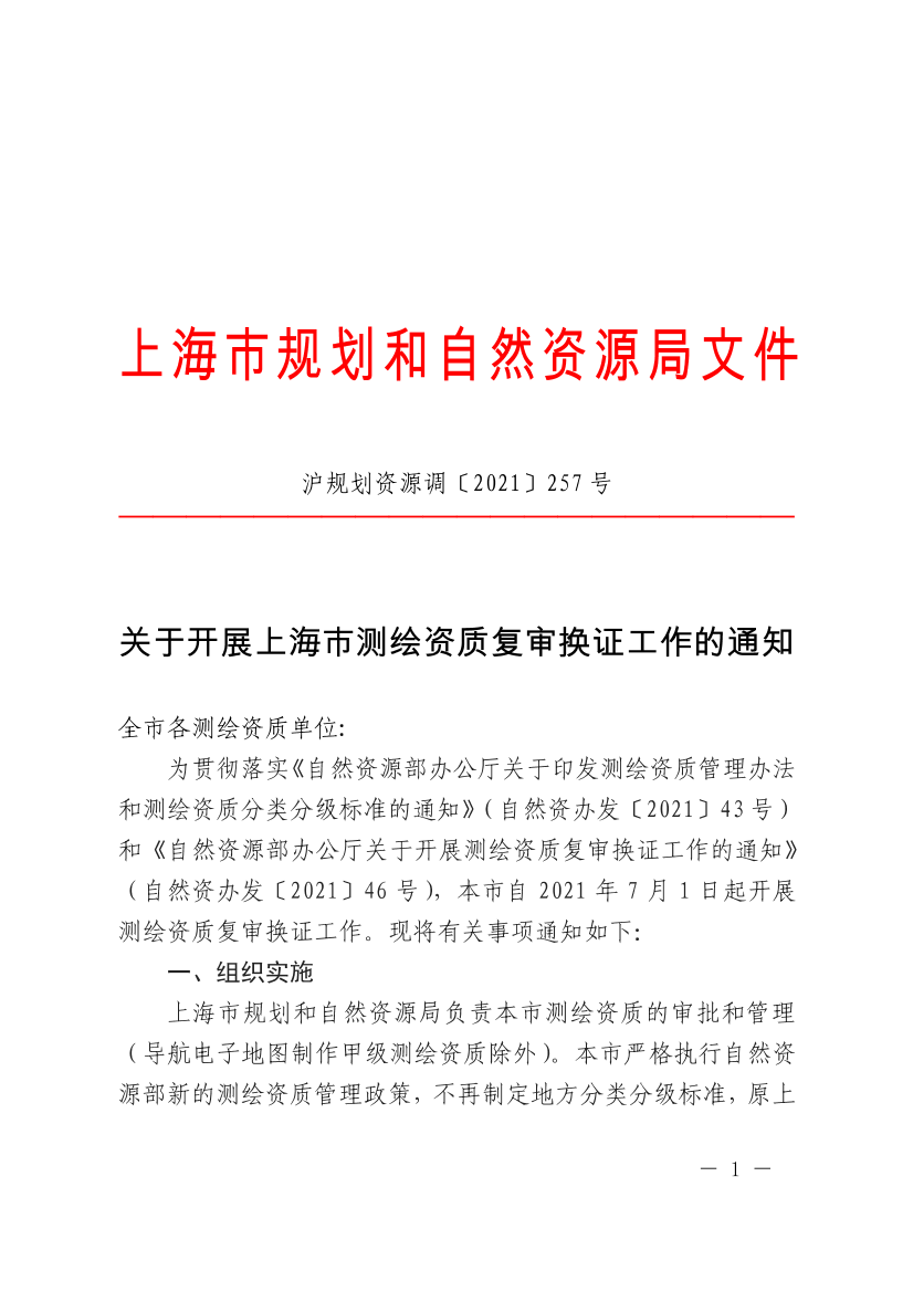 为贯彻落实《自然资源部办公厅关于印发测绘资质管理办法和测绘资质分类分级标准的通知》(自然资办发〔2021〕43号)和《自然资源部办公厅关于开展测绘资质复审换证工作的通知》(自然资办发〔2021〕46号),本市自2021年7月1日起开展测绘资质复审换证工作。现将有关事项通知如下: