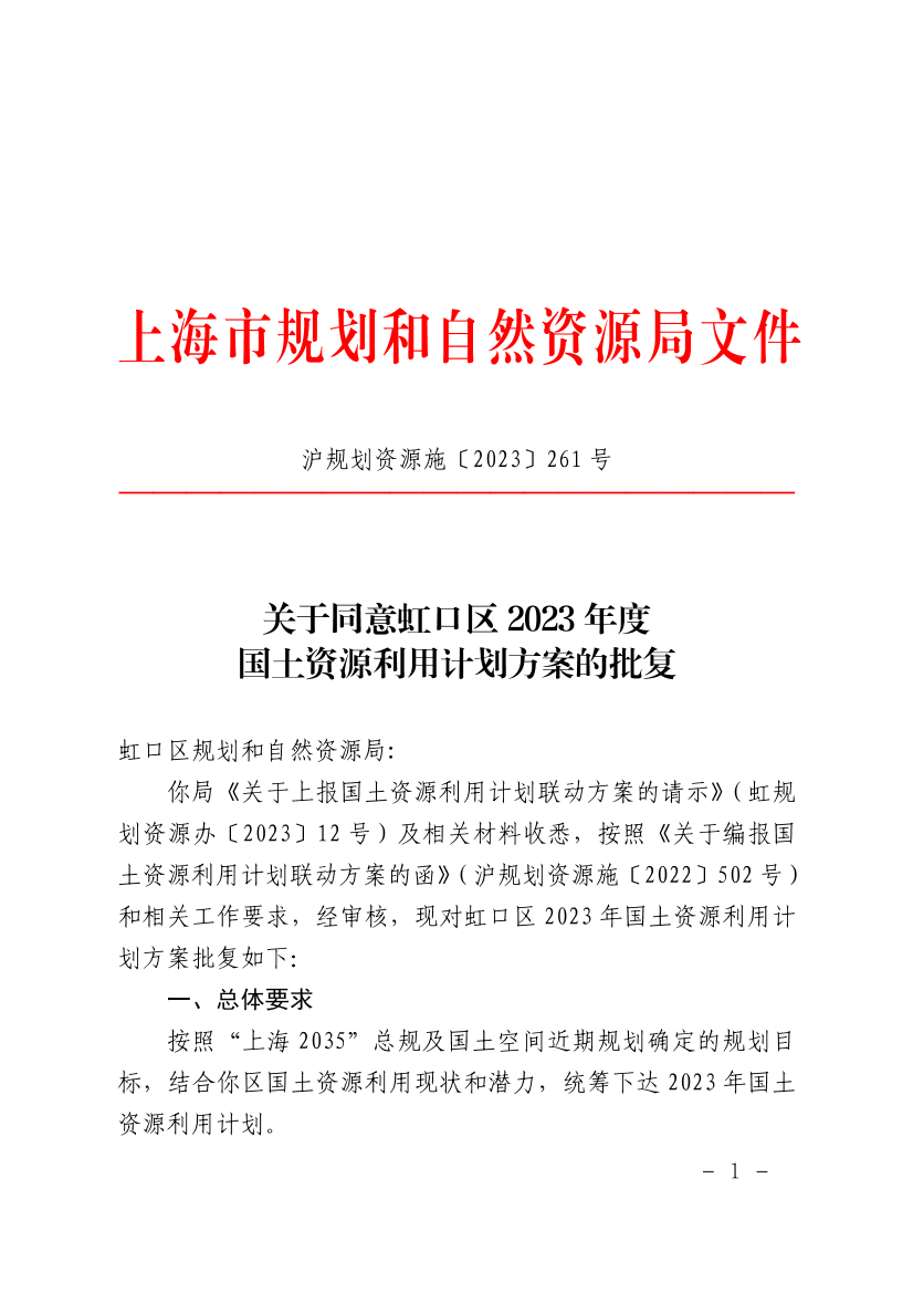 你局《关于上报国土资源利用计划联动方案的请示》(虹规划资源办〔2023〕12号)及相关材料收悉,按照《关于编报国土资源利用计划联动方案的函》(沪规划资源施〔2022〕502号)和相关工作要求,经审核,现对虹口区2023年国土资源利用计划方案批复如下: