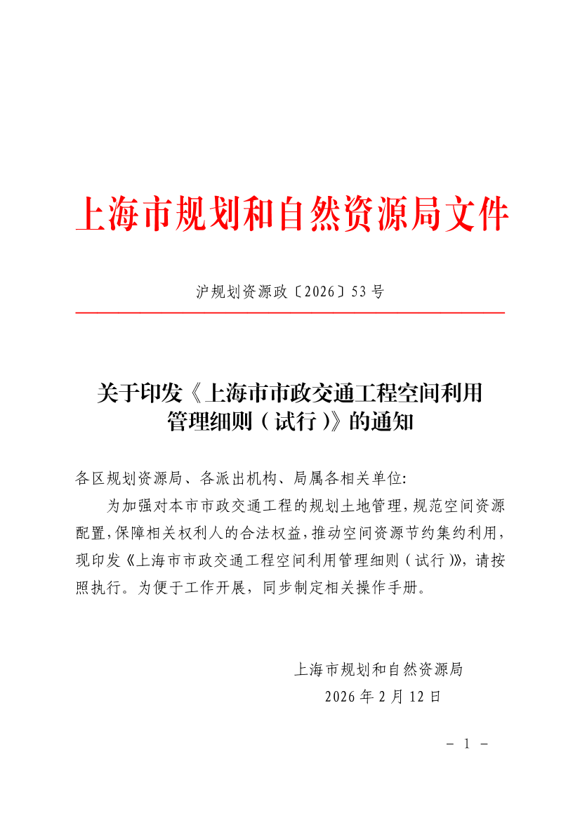 关于印发《上海市市政交通工程空间利用管理细则(试行)》的通知 发布日期:2026-02-13