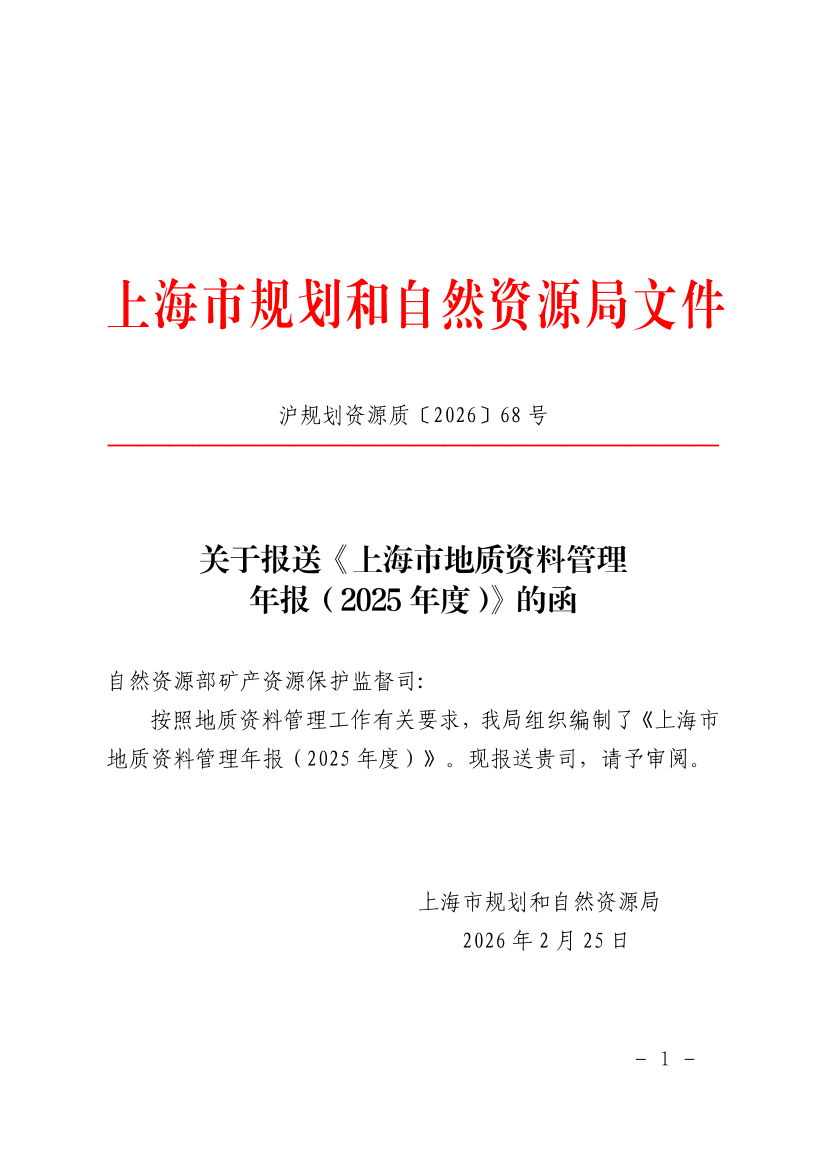 关于报送《上海市地质资料管理年报(2025年度)》的函 发布日期:2026-02-25