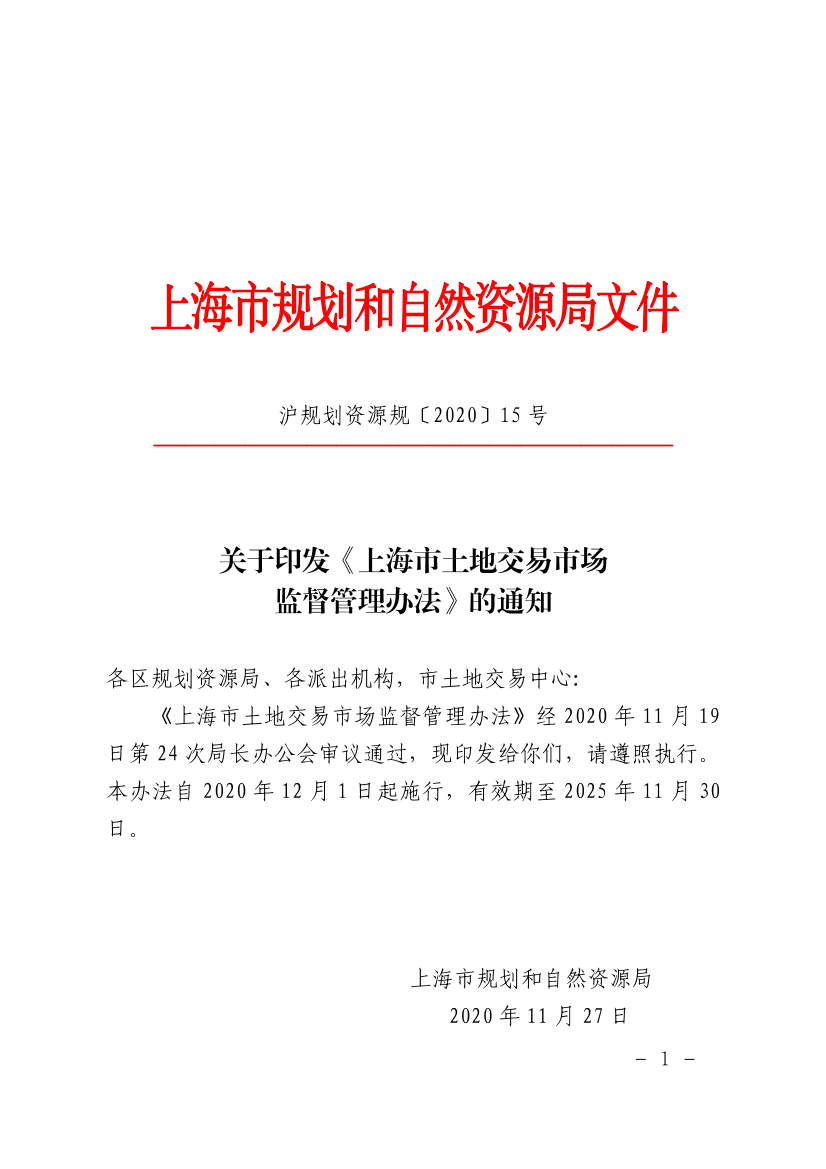 关于印发《上海市土地交易市场监督管理办法》的通知(本办法自2020年12月1日起施行,有效期至2025年11月30日) 发布日期:2020-12-01