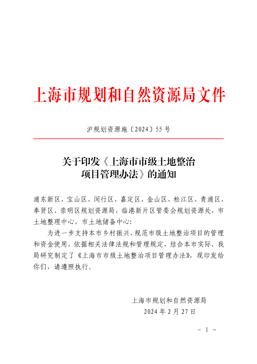 关于印发《上海市市级土地整治项目管理办法》的通知 发布日期:2024-03-01