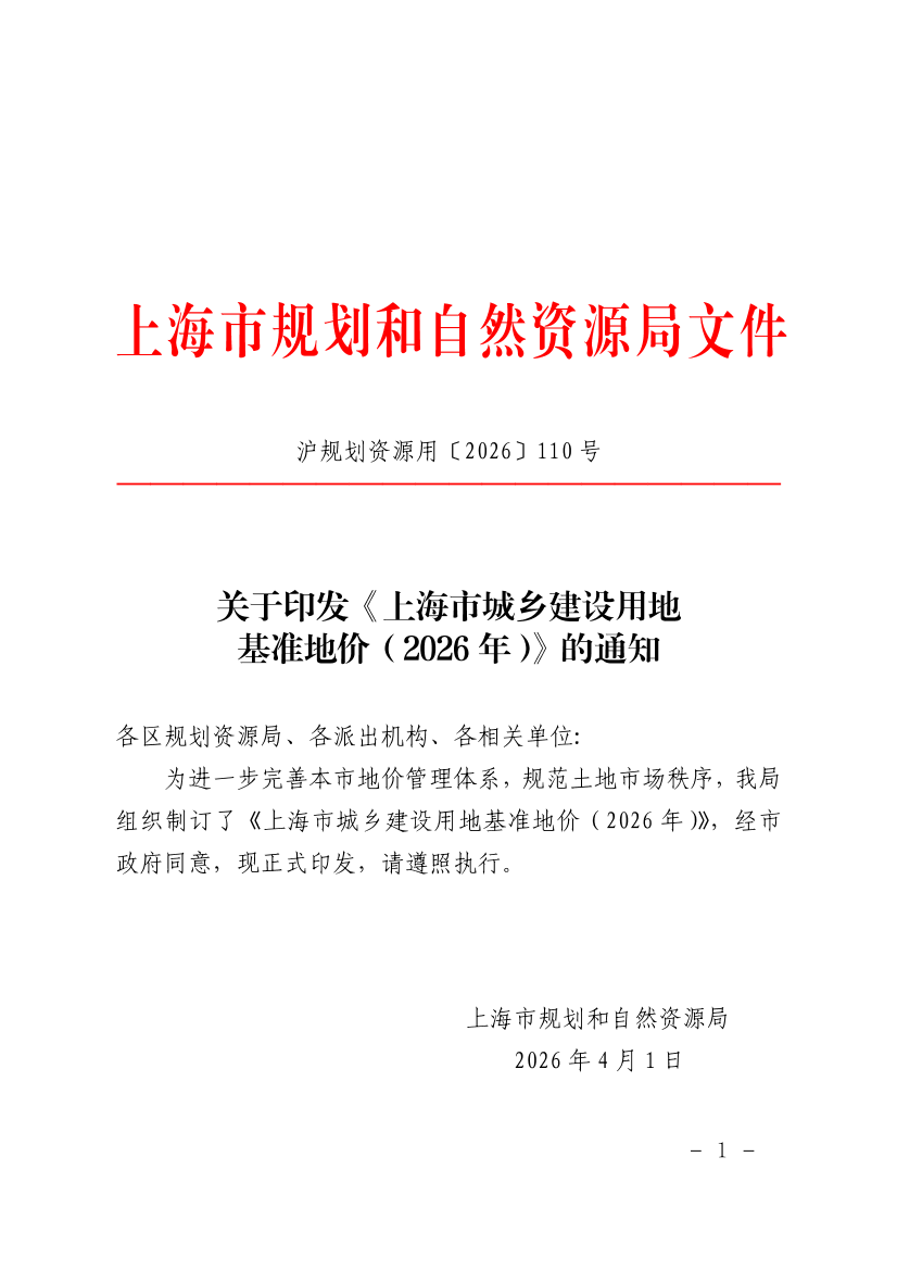 关于印发《上海市城乡建设用地基准地价(2026年)》的通知 发布日期:2026-04-01