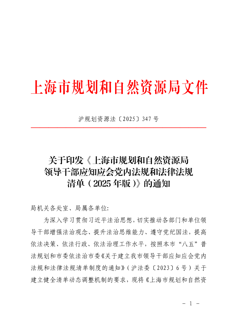 关于印发《上海市规划和自然资源局领导干部应知应会党内法规和法律法规清单(2025年版)》的通知