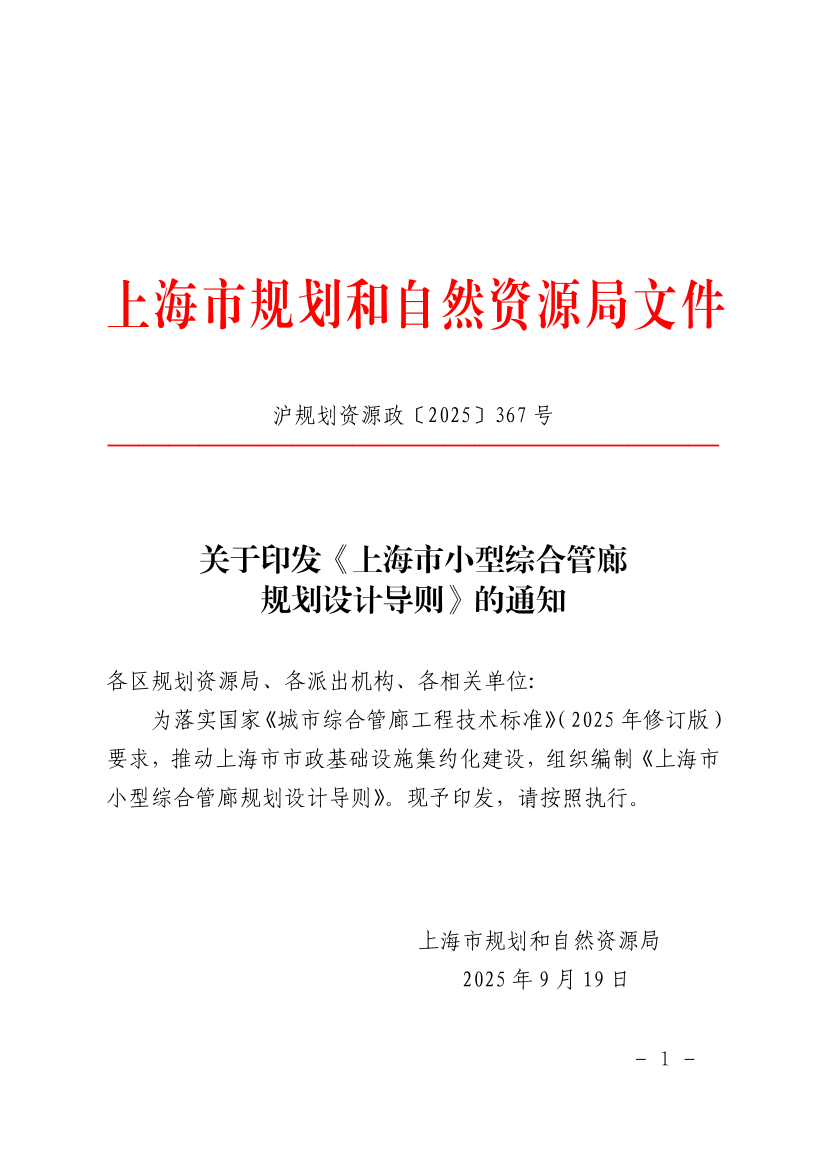 关于印发《上海市小型综合管廊规划设计导则》的通知 发布日期:2025-09-22