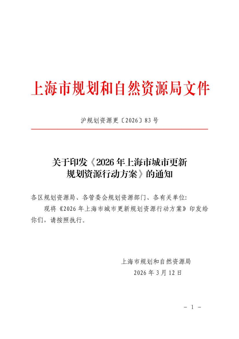 关于印发《2026年上海市城市更新规划资源行动方案》的通知 发布日期:2026-03-12